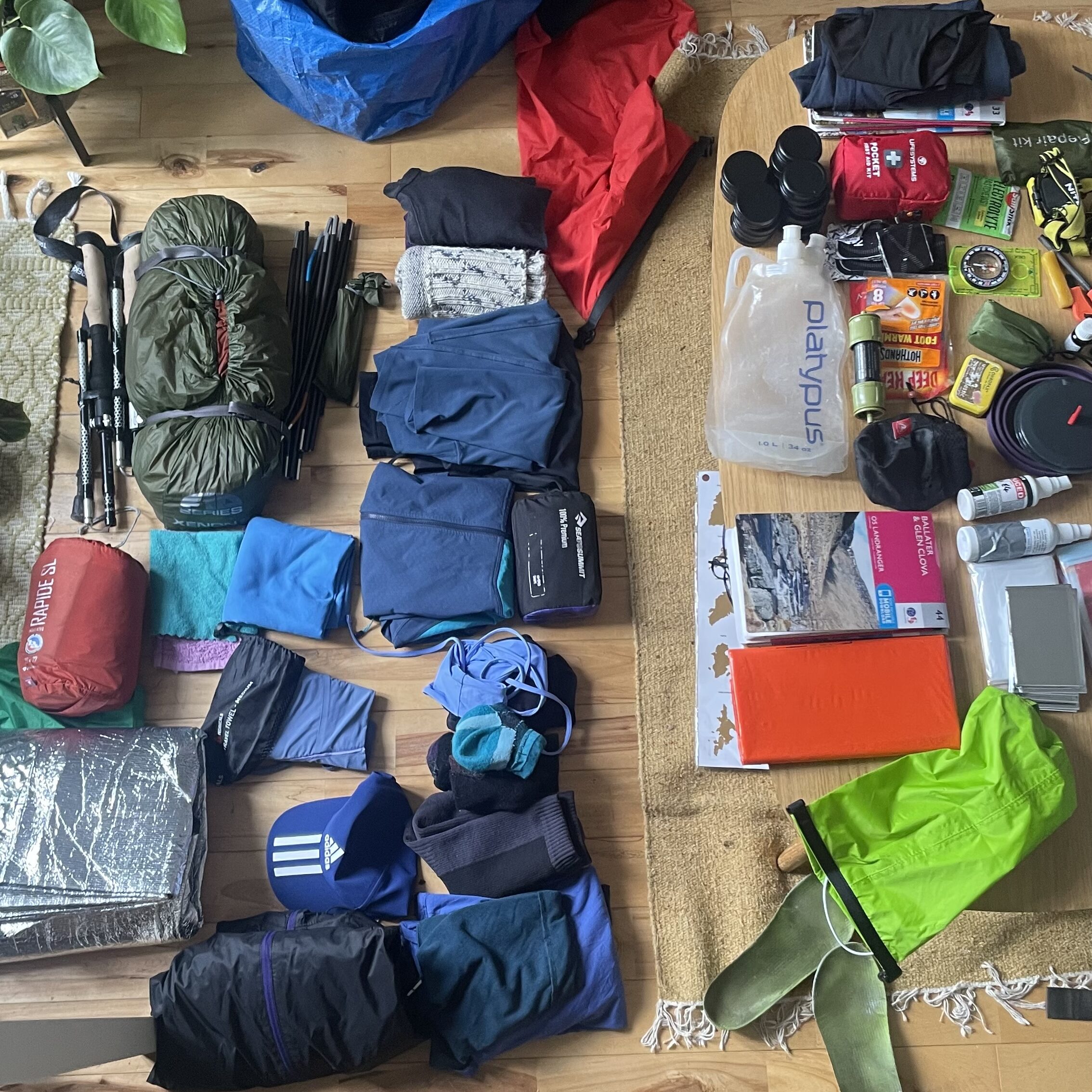 Kit: Alpkit Hippo Water Filter + 1 x 1Lcontainers, Alpkit titanium 900ml cooking pot, Robens Fire Beetle stove, Alpkit Jasper Fire lighter, head torch donation from someone I can no longer Platypus water remember, but it is still working. First Aid kit from go outdoors, but tailored to my needs includes KT tape, teatree oil, beeswax, beeswax&cotton earbuds (are great fire starters), a tincan with dry tinder, an emergency blanket and an emergency shelter bag, two emergency flou lights, compas, maps, hand and feet warmers, a whistle and two different type of midges/tick repellents.